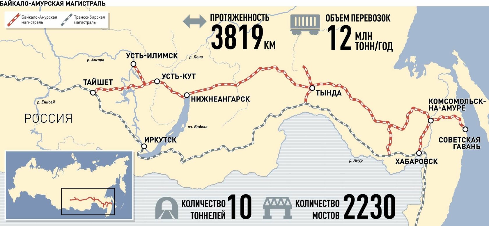Основной путь Тайшет - Советская Гавань строился с большими перерывами с 1938 по 1984 годы, его длина 3819 километров. БАМ проходит севернее трассы Транссибирской магистрали, ответвляясь от неё в Тайшете, пересекает реки - Ангару в Братске и Лену в Усть-Куте, проходит через Северобайкальск, огибая с севера озеро Байкал, затем через Тынду, пересекает реку Амур в Комсомольске-на-Амуре и заканчивается на берегу Тихого океана в Советской Гавани.