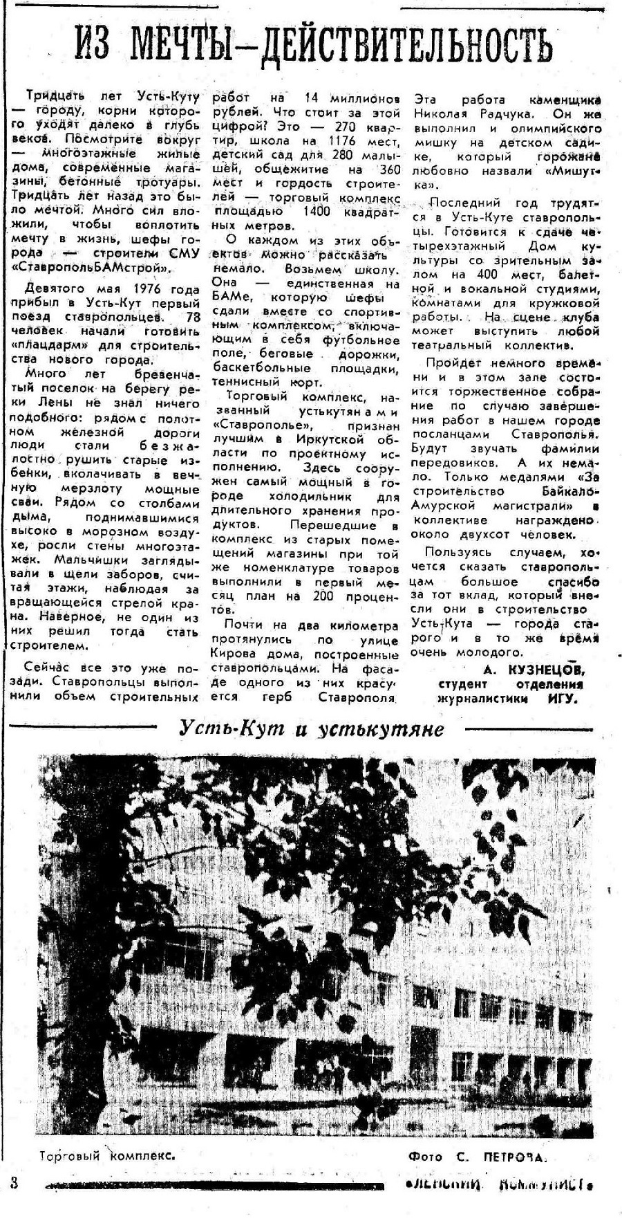 5 апреля 1979 года первые капитальные объекты станции Лена сдал в эксплуатацию коллектив «СтавропольБАМстрой». 15 июня 1979 года коллектив СМУ КраснодарБАМстроя, впервые на севере применив объемно-блочное домостроение, закончил монтаж первого девятиэтажного дома в Усть-Куте.